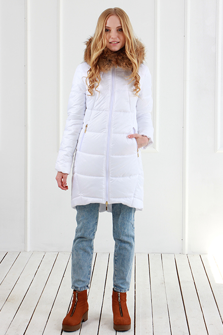 Молодежное зимнее полупальто с центральной застежкой на витую молнию и мягким капюшоном, с втачным рукавом и удлиненной спинкой. Полуприлегающий силуэт, зауженный книзу. Удобные прорезные карманы на молнии в фигурных рельефах. Опушка капюшона отстегивается. Натуральный мех(енот). В изделии использована система утепления Air Twin (от 0 °С до -20 °С). Длина пальто по спинке ок.94см. Длина рукава ок.64см. Рост модели 174см