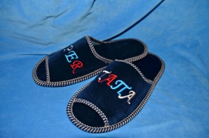 Ткань-велюр. Украшение - вышивка разноцветной вискозной нитью "SUPER ПАПА". Пришивная подошва.